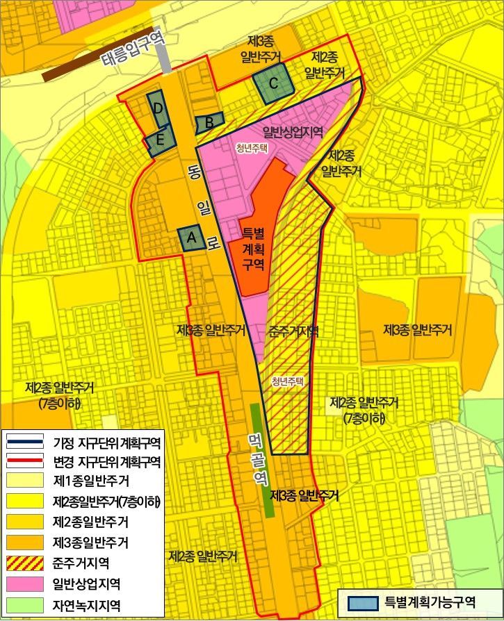 주요 내용은 묵2동 동일로변 일대의 지구단위계획구역을 대폭 확대하는 것이다. 이와 함께, 특별계획가능구역 5개소와 용도지역조정가능지 10개소를 신설해 민간 주도의 대규모 통합개발을 지원할 계획이다.