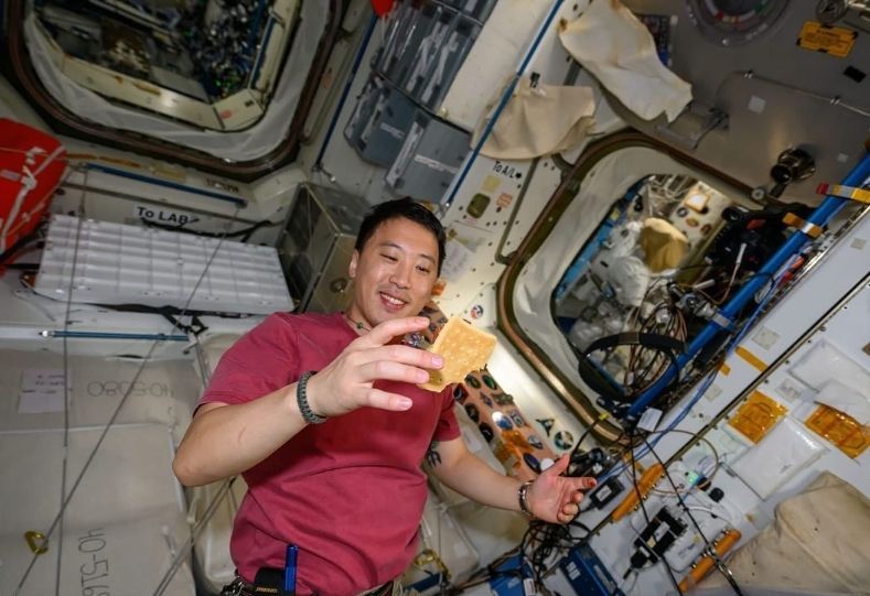 한국계 미국인 우주비행사 조니 김이 우주에서 만든 고추장 버거를 먹고 있다. 조니 김 인스타그램