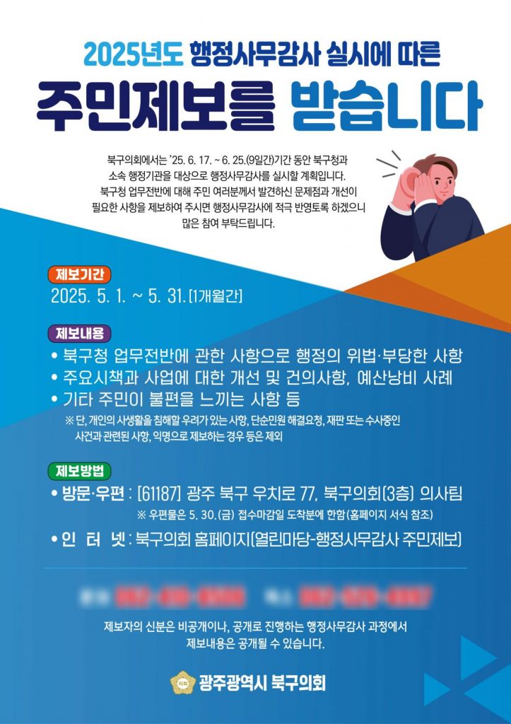 제보는 북구의회 누리집과 의회사무국 방문, 우편, 팩스로 가능하며, 제보자의 신원은 철저히 비공개로 보호된다.