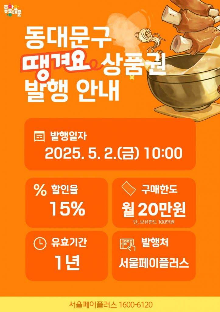 이어 2일 오전 10시부터는 3억 원 규모의 '동대문구땡겨요상품권'이 발행된다. 서울시 공공배달앱 '땡겨요'를 통해 사용할 수 있으며, 15% 할인율이 적용돼 주민들의 가계 부담을 덜고 소상공인의 경영 안정에도 기여할 것으로 기대된다.
