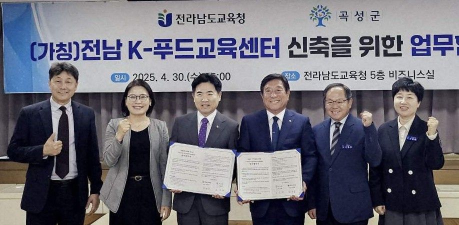 전남 곡성군(군수 조상래)은 지난달 30일 전라남도교육청 비즈니스실에서 전남도교육청(교육감 김대중)과 (가칭)전남 K-푸드교육센터의 성공적 신축을 위한 업무협약을 체결했다고 1일 밝혔다.