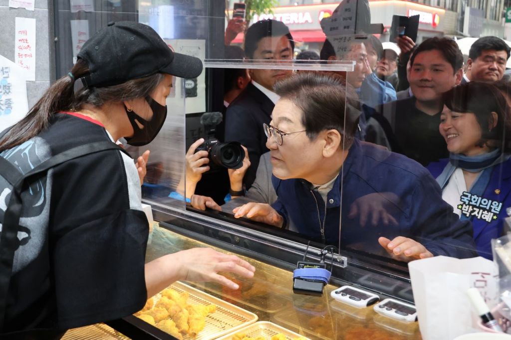 이재명 더불어민주당 대선 후보가 1일 전국 각지에서 민심을 듣는 '골목골목 경청투어'을 시작하며 경기도 포천의 한 치킨집 상인을 만나 인사하고 있다. 연합뉴스