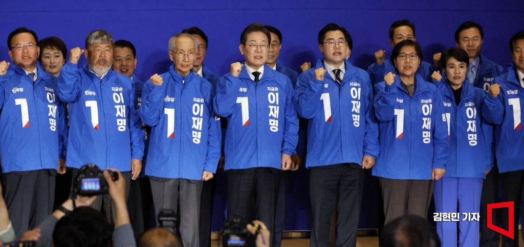 30일 서울 여의도 국회 의원회관에서 열린 더불어민주당 제21대 대통령선거 '진짜 대한민국' 중앙선거대책위원회 출범식에서 이재명 대선 후보와 선대위원장들이 선거 점퍼를 입고 화이팅을 외치고 있다. 2025.4.30 김현민 기자