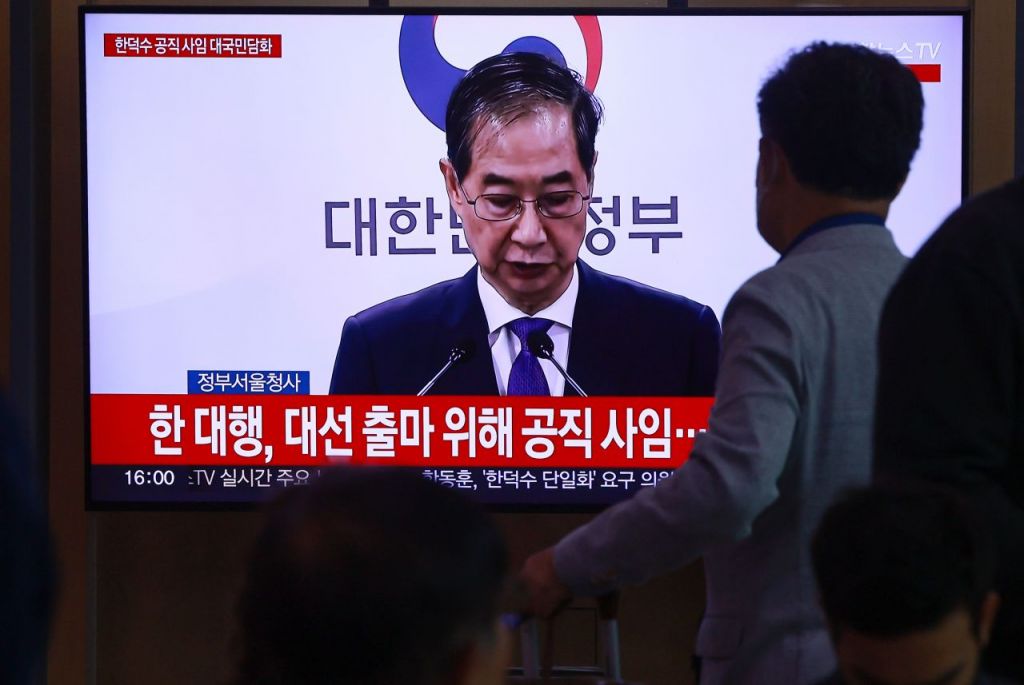 1일 서울역 대합실에서 시민이 한덕수 대통령 권한대행 국무총리의 대국민담화 생중계를 보고 있다. 2025.5.1 연합뉴스