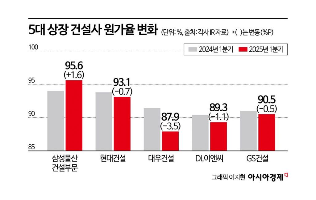 7일 금융감독원 전자공시시스템에 공시된 2025년 1분기 사업보고서를 보면 삼성물산 건설부문, 현대건설, 대우건설, DL이앤씨, GS건설 등 국내 주요 5대 건설사 모두 전년 동기 대비 매출이 줄어든 것으로 나타났다. 다만 원가율은 삼성물산을 제외한 4개 사가 일제히 하락세를 보였다. 대우건설은 91.4%에서 87.9%로, DL이앤씨는 90.4%에서 89.3%로 원가율을 낮췄고, 현대건설과 GS건설도 각각 0.7%포인트, 0.5%포인트씩 개선하며 수익성을 유지했다.