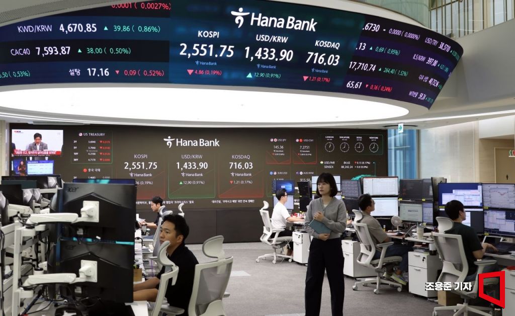 헌정사상 처음으로 대통령 권한대행의 대행의 대행체제가 되면서 국내 경제상황의 불확실성이 커진 2일 서울 중구 하나은행 본점 딜링룸 현황판에 코스피, 원/달러 환율이 표시돼 있다. 이날 코스피는 전장보다 0.09포인트 내린 2,556.52로 원/달러 환율은 15.5원 오른 1,436.5원에 장을 시작했다. 2025.5.2 조용준 기자