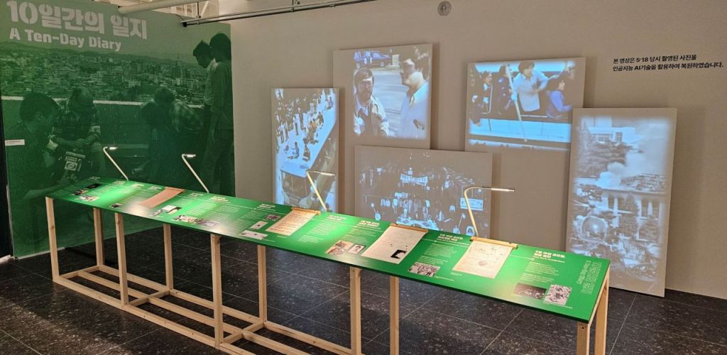 전시는 ▲푸른 눈의 이웃 ▲10일간의 일지 ▲오월 이후 등 3개 구역으로 구성됐다. 첫 번째 구역은 세 외국인의 삶과 활동을 소개하고, 두 번째 구역에서는 10일 간의 광주항쟁 기간에 그들이 마주한 장면들을 텍스트와 사진, 인공지능(AI) 기술을 활용한 영상으로 재현한다. 세 번째 구역은 광주의 진실을 알리기 위해 이들이 국내외에서 펼친 활동과 자료들을 전시한다.