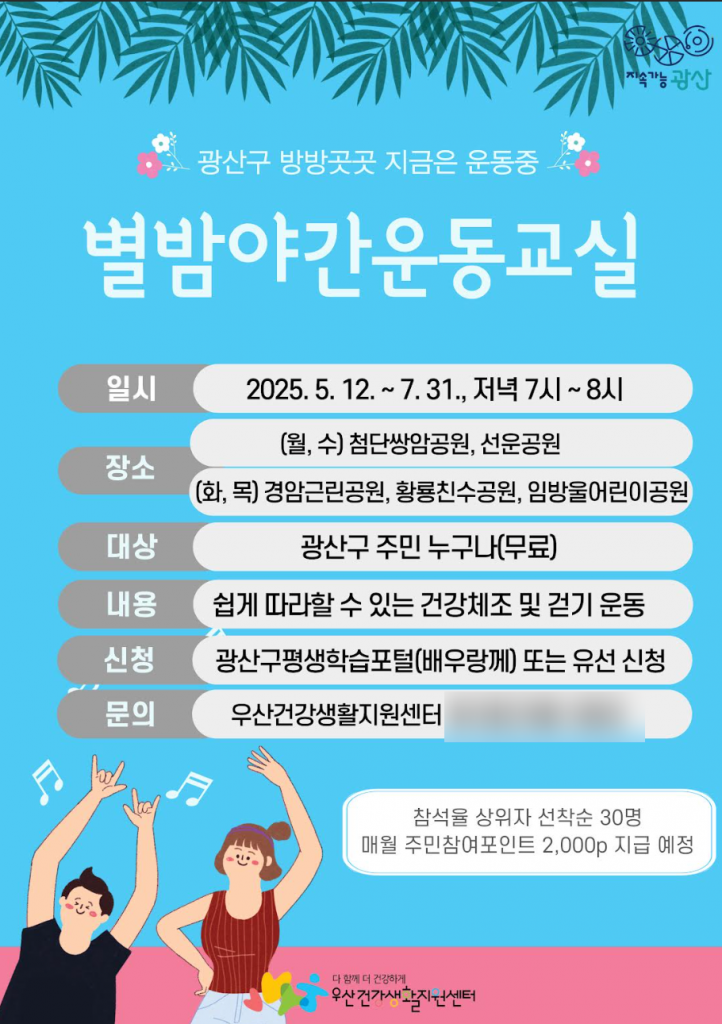 광주 광산구가 퇴근 후 공원에서 가볍게 몸을 풀 수 있는 '별밤 야간 운동 교실'을 연다. 5개 공원에서 주 2회, 무료로 운영된다.