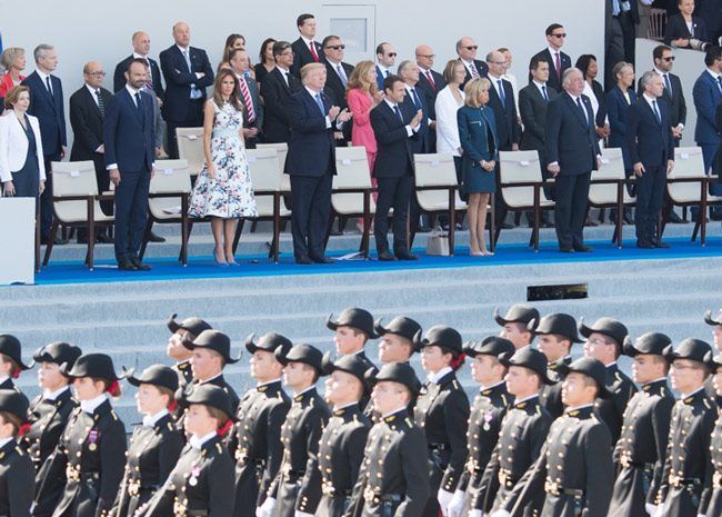 2017년 프랑스 방문 당시 에마뉘엘 마크롱 프랑스 대통령과 바스티유 군사 퍼레이드를 지켜보는 도널드 트럼프 미국 대통령. 사진 AP=연합뉴스