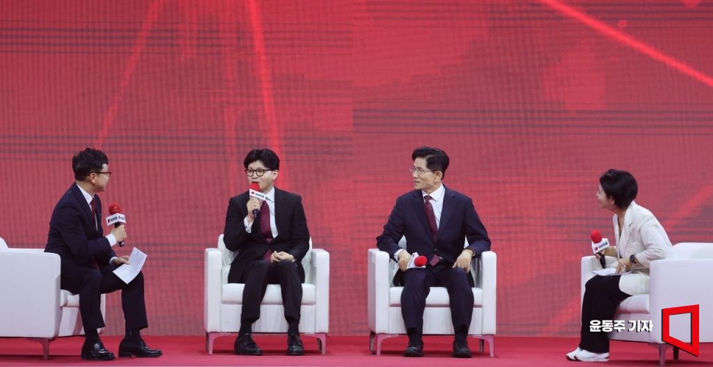 한동훈, 김문수 국민의힘 대선 경선 후보가 3일 경기 고양시 킨텍스에서 열린 5차 전당대회에서 토크 콘서트를 하고 있다.
