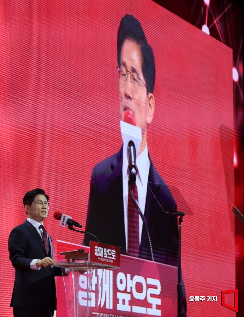 김문수 국민의힘 대통령 후보가 3일 경기 고양시 킨텍스에서 열린 5차 전당대회에서 최종 후보로 확정된 후보 승낙 연설을 하고 있다.