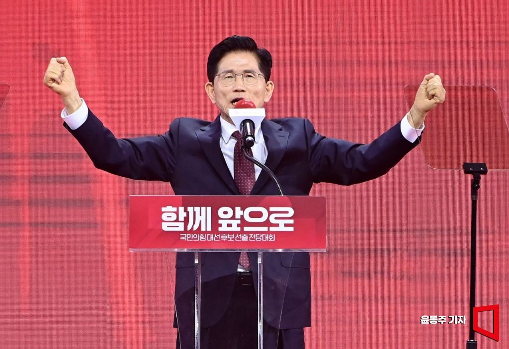 김문수 국민의힘 대통령 후보가 3일 경기 고양시 킨텍스에서 열린 5차 전당대회에서 최종 후보로 확정된 후보 수락 연설을 하고 있다.