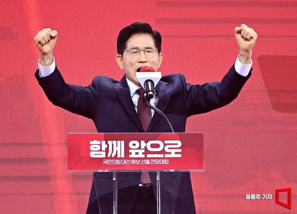 김문수 국민의힘 대통령 후보가 3일 경기 고양시 킨텍스에서 열린 5차 전당대회에서 최종 후보로 확정된 후보 수락 연설을 하고 있다.