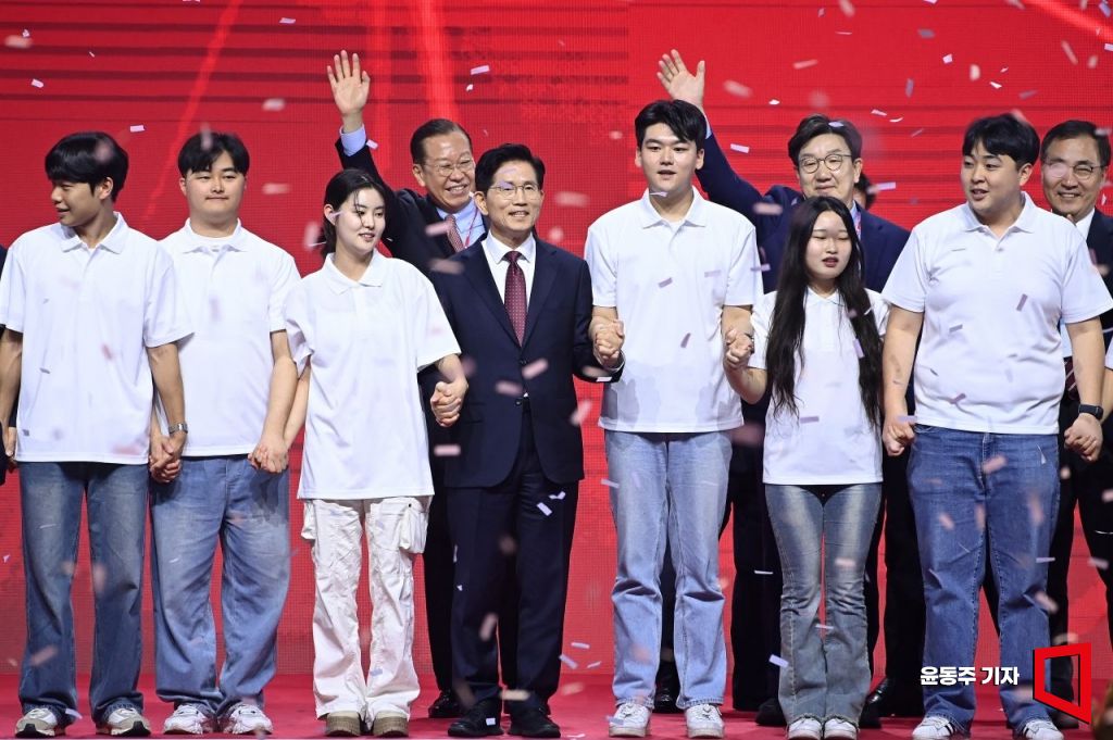 국민의힘 김문수 대선 후보가 3일 경기 일산 킨텍스에서 열린 제5차 전당대회에서 청년 당원들과 기념촬영을 하고 있다.