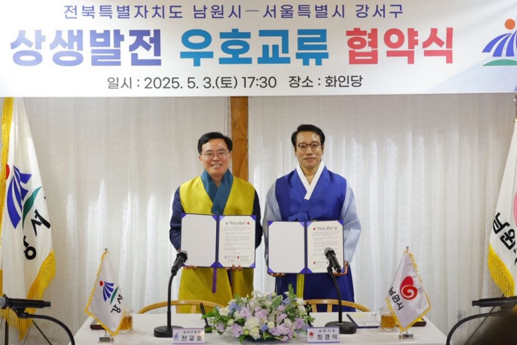서울 강서구(구청장 진교훈)와 전북특별자치도 남원시(시장 최경식)가 3일 남원시 한복문화체험관 화인당에서 우호교류 협약을 체결하고 두 도시의 상생발전을 위한 협력에 나섰다.