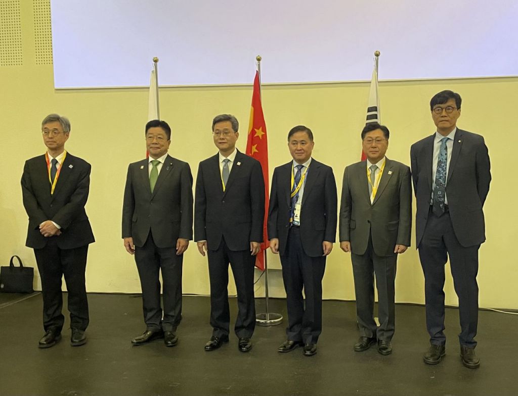 (왼쪽부터)히미노 료조 일본은행 부총재, 가토 가쓰노부 일본 재무상, 란 포안 중국 재무장관, 판궁성 중국 인민은행장, 최지영 기획재정부 차관보, 이창용 한국은행 총재가 4일(현지시간) 이탈리아 밀라노에서 열린 한·일·중 재무장관·중앙은행 총재회의에 참석한 후 사진 촬영을 하고 있다. 한국은행