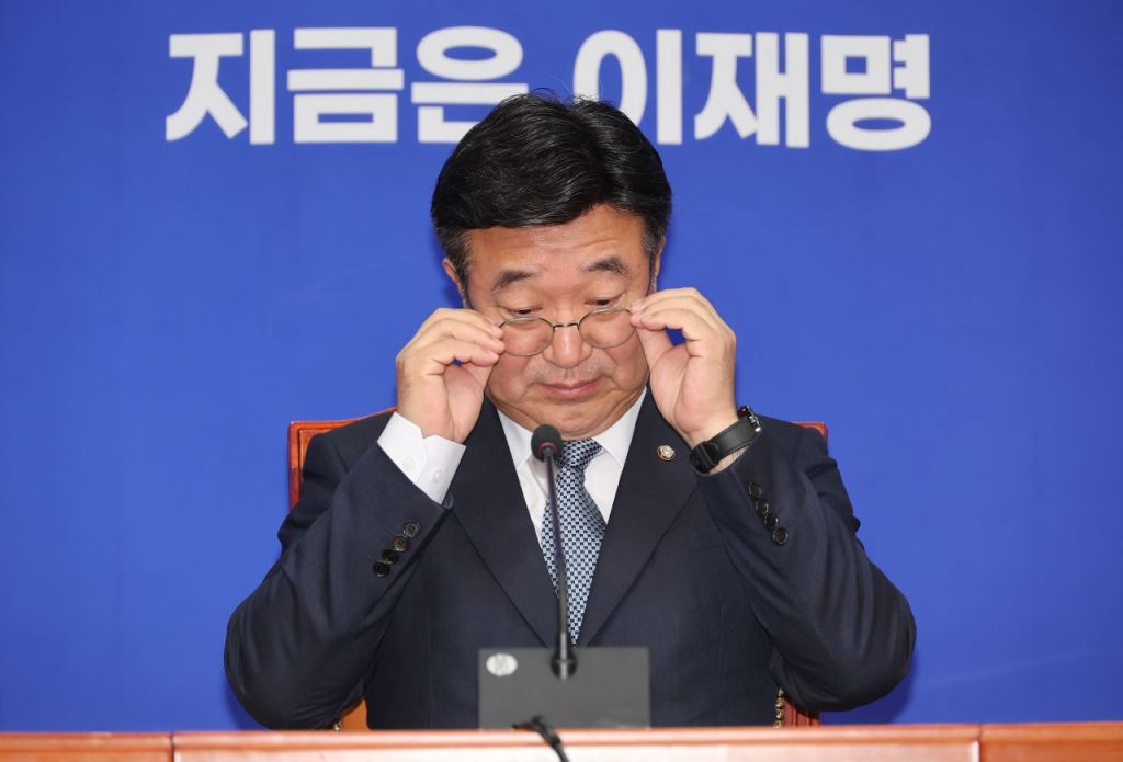 5일 서울 여의도 국회에서 윤호중 더불어민주당 총괄선대본부장이 기자간담회를 하고 있다. 연합뉴스