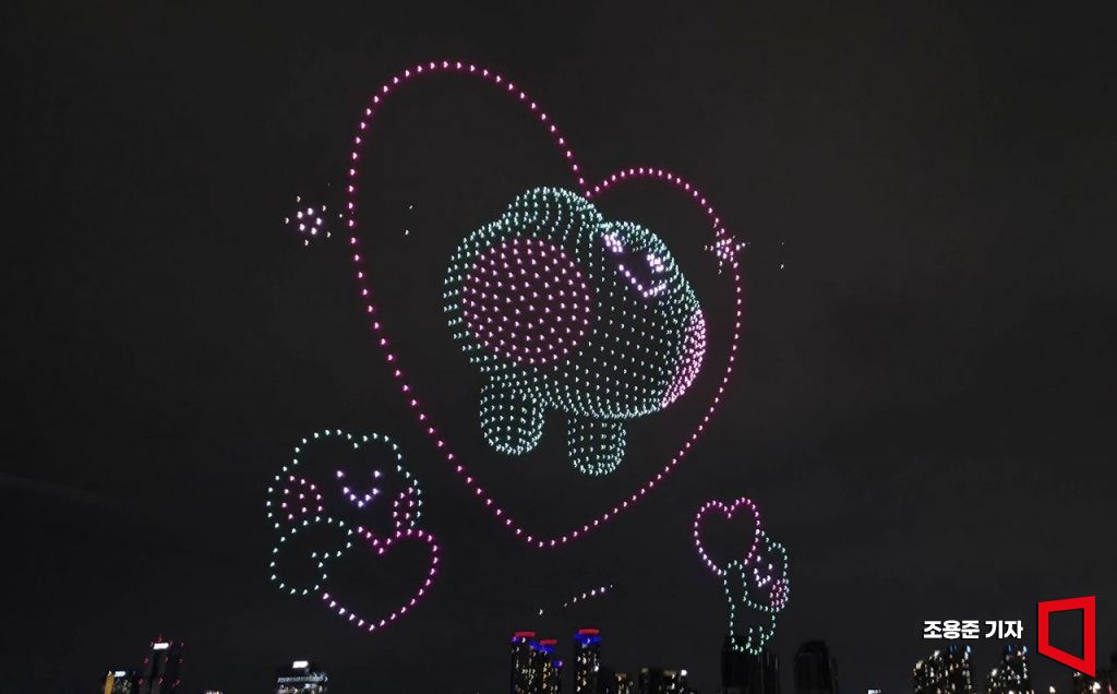 어린이날인 5일 서울 뚝섬한강공원에선 한강드론라이트쇼가 열린 가운데 1천여대의 드론이 연출한 다양한 캐릭터들이 밤하늘을 수놓고 있다. 다음 뚝섬 드론쇼는 5월 11일 밤 8시30분에 열린다.