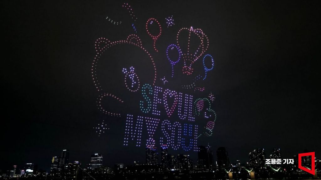 어린이날인 5일 서울 뚝섬한강공원에선 한강드론라이트쇼가 열린 가운데 1천여대의 드론이 연출한 다양한 캐릭터들이 밤하늘을 수놓고 있다. 다음 뚝섬 드론쇼는 5월 11일 밤 8시30분에 열린다.