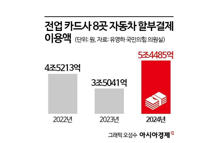 7일 유영하 국민의힘 의원실이 금융감독원으로부터 받은 자료에 따르면 전업 카드사 8곳(삼성·신한·현대·KB국민·롯데·우리·하나·BC)의 할부 서비스 이용액 중 자동차 할부 이용액은 지난해 5조4485억원에 달했다. 전년(3조5041억원) 대비 55.5% 증가했다.