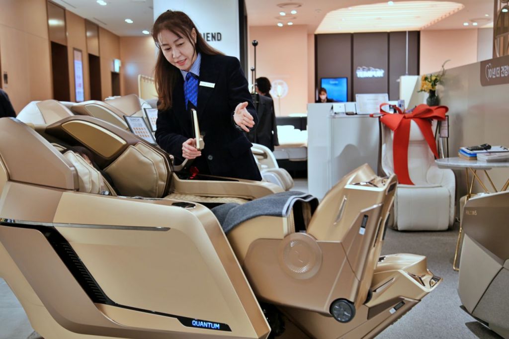 광주신세계 본관 8층 바디프랜드 매장에서 직원이 고객에게 안마의자 '퀀텀'의 기능을 설명하고 있다. 광주 신세계