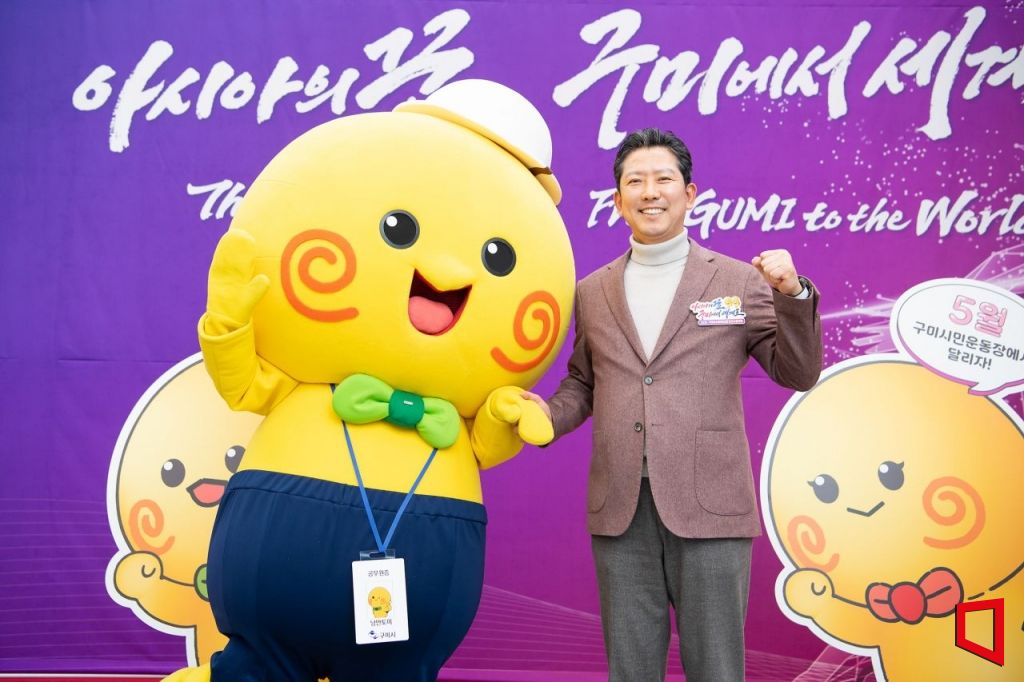경북 구미아시아육상경기선수권대회 성공다짐 시민보고회에서 김장호 시장이 마스코트와 사진촬영 하고 있다.