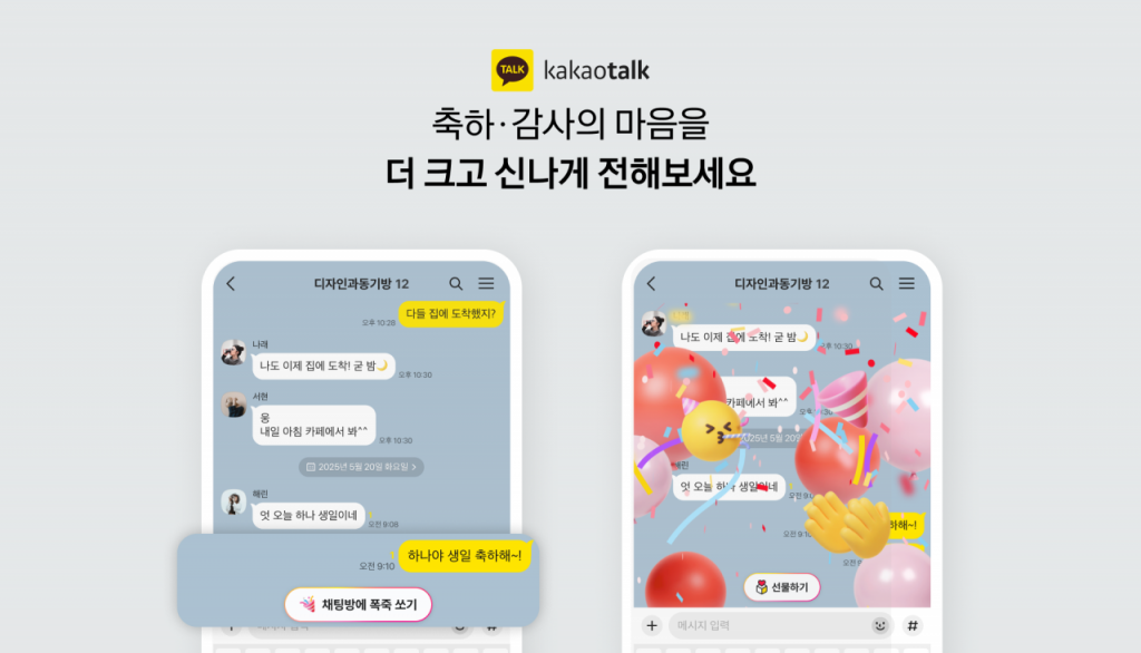 앞서 카카오는 '첫눈'·'추석' 같은 특정 키워드를 입력하면 채팅창에 시각 효과가 적용되는 이벤트를 지속해 왔다. 이번 기능은 이런 키워드 기반 상호작용 기능을 일상 속 감정 표현까지 확장한 것이다.