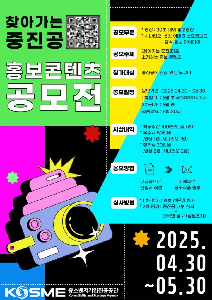 공모 분야는 '찾아가는 중진공'을 소개하는 30초 이내 홍보 영상 혹은 6컷 이내 스토리보드 형식의 시나리오 등 2개 부문이다.