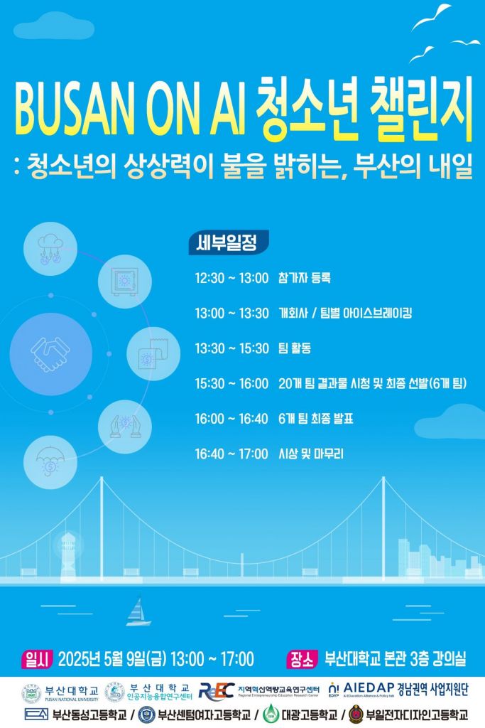 이 행사는 부산대 인공지능융합연구센터와 지역혁신역량교육연구센터가 공동 주관하고, 부산동성고, 부산센텀여자고, 대광고, 부일전자디자인고 등 부산지역 일반고와 특성화고가 참여한다.