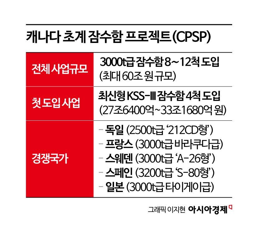 양사가 제안서를 제출한 건 캐나다가 3000t급 잠수함 8∼12척을 도입하는 최대 60조 원 규모의 '캐나다 초계 잠수함 프로젝트'(CPSP)를 추진하고 있기 때문이다. CPSP 전체 일정은 공개되지 않았지만 캐나다 왕립 해군은 낡은 잠수함을 대체할 최신형 KSS-III 잠수함 4척을 먼저 도입할 예정이다. 200억~240억 달러(약 27조6400억~33조1680억 원) 규모다.
