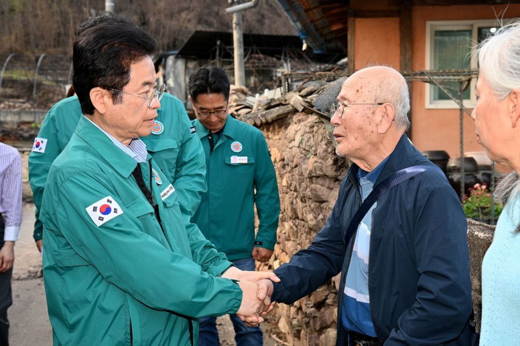 이철우 경북지사(왼쪽)가 산불피해 지역을 방문해 이재민을 격려하고 있다.