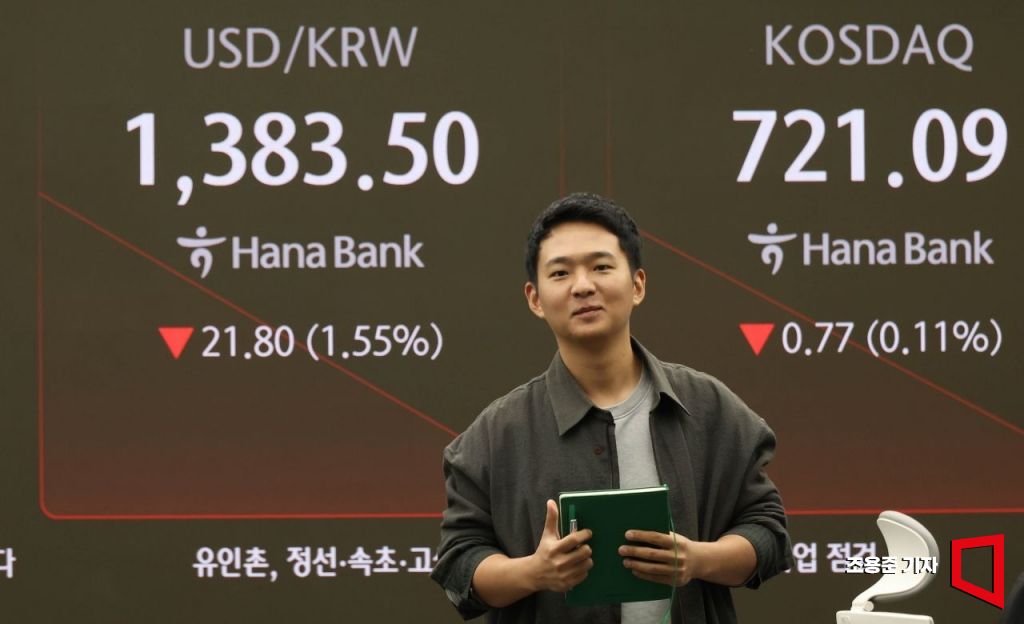 뉴욕 증시의 3대 지수가 일제히 하락한 가운데 원/달러 환율이 1400원 아래로 떨어진 7일 서울 중구 하나은행 본점 딜링룸 현황판에 코스피, 원/달러 환율이 표시돼 있다. 이날 코스피는 전장보다 16.83포인트 오른 2,576.62에 원/달러 환율은 25.3원 내린 1,380.0원에 장을 시작했다.