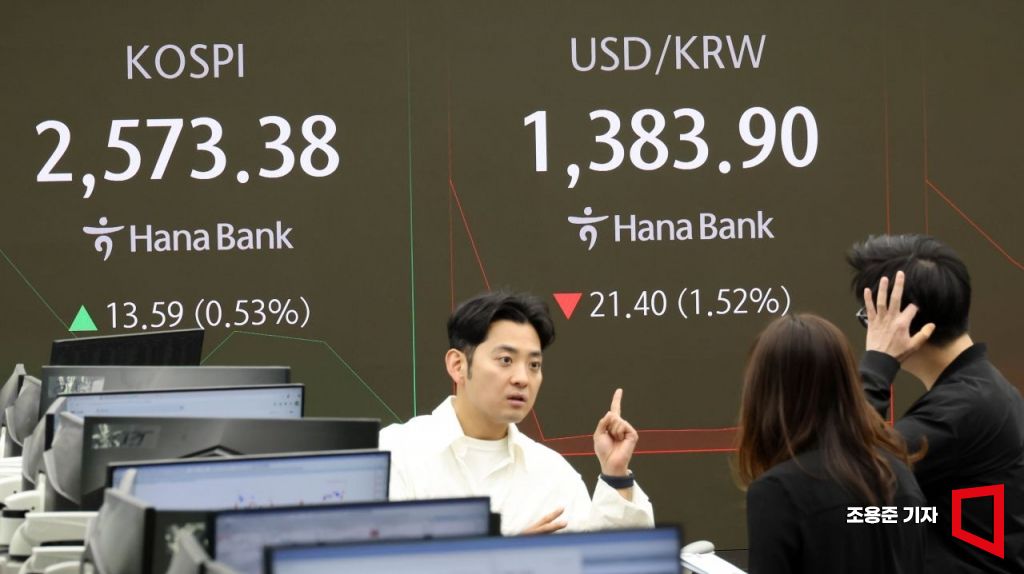 뉴욕 증시의 3대 지수가 일제히 하락한 가운데 원/달러 환율이 1400원 아래로 떨어진 7일 서울 중구 하나은행 본점 딜링룸 현황판에 코스피, 원/달러 환율이 표시돼 있다. 이날 코스피는 전장보다 16.83포인트 오른 2,576.62에 원/달러 환율은 25.3원 내린 1,380.0원에 장을 시작했다.