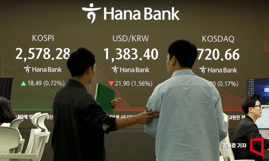 뉴욕 증시의 3대 지수가 일제히 하락한 가운데 원/달러 환율이 1400원 아래로 떨어진 7일 서울 중구 하나은행 본점 딜링룸 현황판에 코스피, 원/달러 환율이 표시돼 있다. 이날 코스피는 전장보다 16.83포인트 오른 2,576.62에 원/달러 환율은 25.3원 내린 1,380.0원에 장을 시작했다.