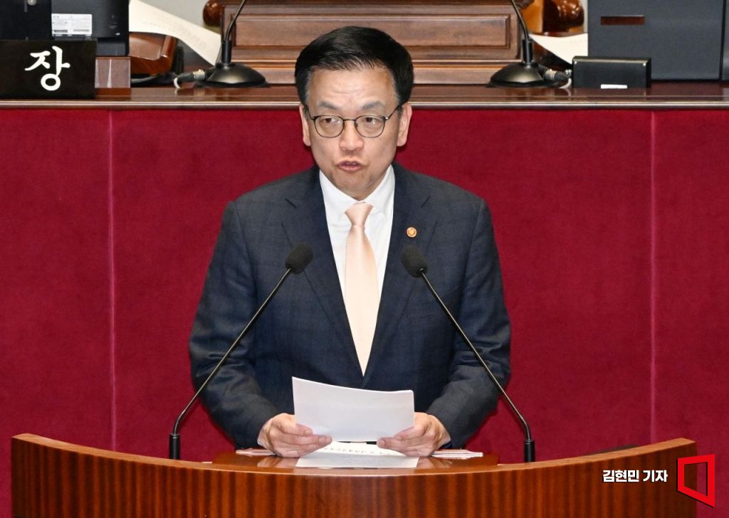 최상목 경제부총리 겸 기획재정부 장관이 28일 국회에서 열린 예산결산특별위원회에서 제안설명을 하고 있다. 이날 회의에는 정부가 제출한 12조 2천억원의 추가경정예산(추경)안을 심사하는 종합정책질의를 진행한다. 2025.4.28 김현민 기자
