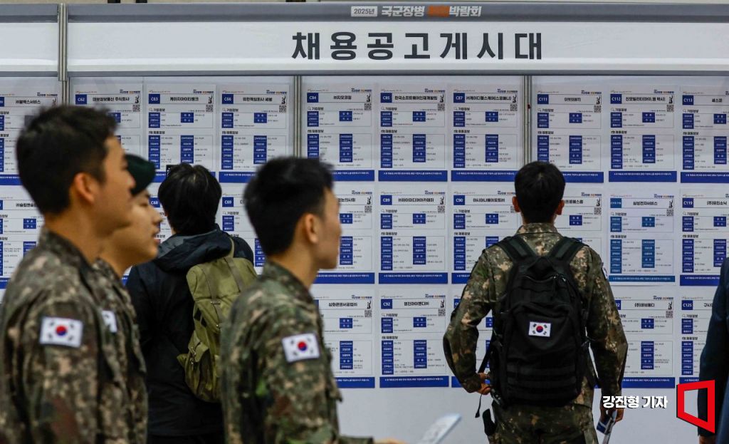 7일 경기 고양 킨텍스에서 열린 '2025년 국군장병 취업박람회'에 참가한 국군장병들이 채용게시판을 보고 있다.