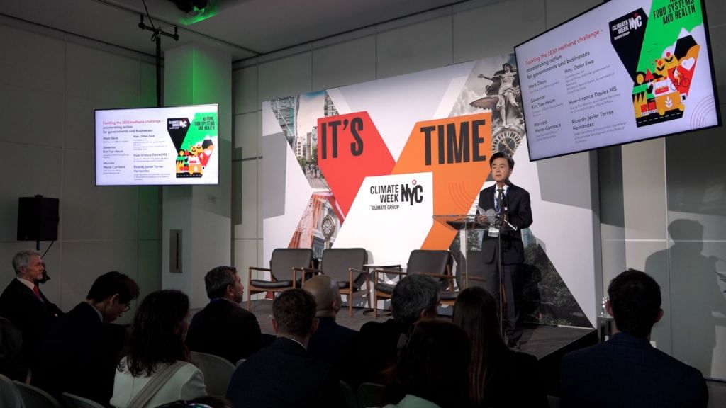 지난해 9월 미국 뉴욕에서 열린 2030 글로벌 메탄감축 전략 토론회에 참석 기조연설을 하고 있는 김테흠 충남지사./충남도 제공
