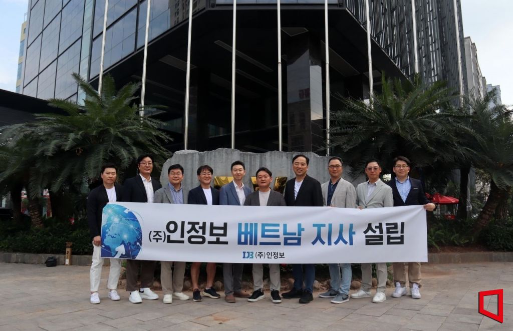 인정보는 베트남 하노이에 연구개발 센터를 개소했다. 왼쪽부터 마정민 부장, 이동철 상무, 박영준 전무, 이성주 부사장, 민만기 베트남지사장, 인재형 대표, 황성익 부사장, 이상영 부사장, 이동규 상무, 이준호 이사가 기념촬영을 하고 있다. 사진=인정보 제공
