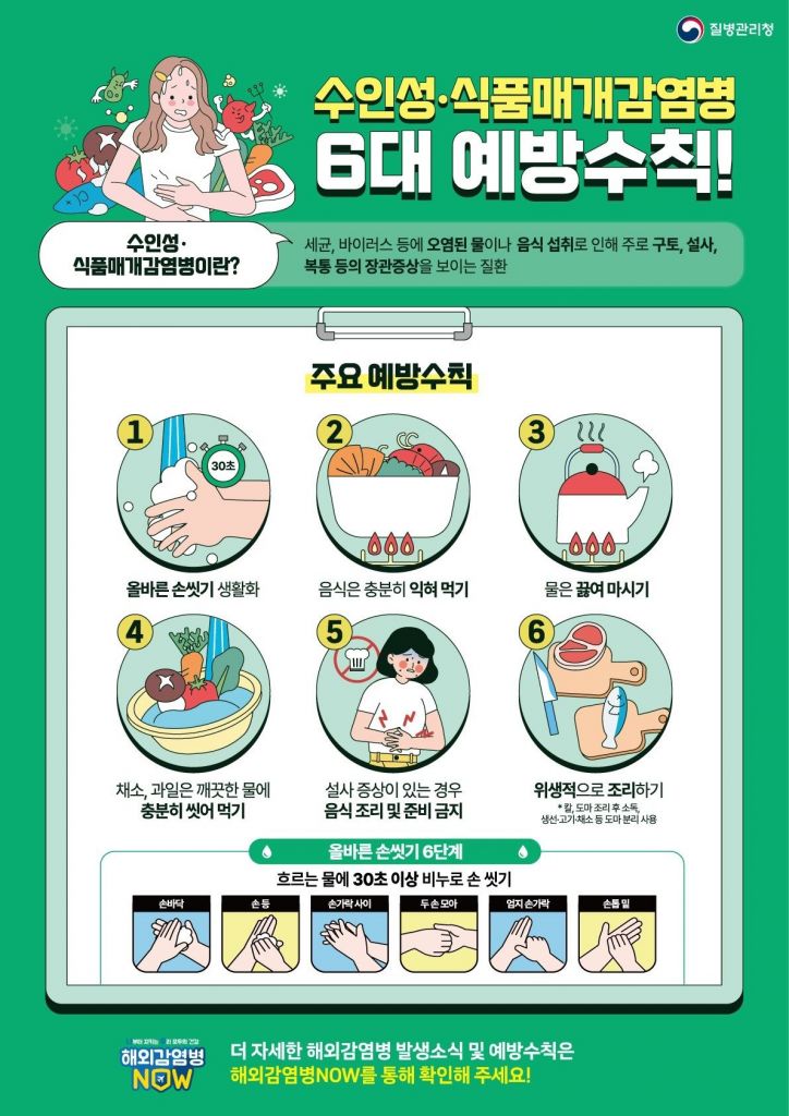 수인성·식품 매개 감염병을 예방하기 위해서는 ▲올바른 손 씻기 생활화 ▲음식은 충분히 익혀 먹기 ▲물은 끓여 마시기 ▲채소, 과일은 깨끗한 물에 충분히 씻어 먹기 ▲설사 증상이 있는 경우 음식 조리 및 준비 금지 ▲위생적으로 조리하기 등 6대 예방 수칙을 준수해야 한다.