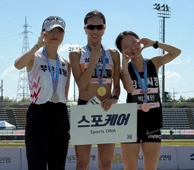 삼척시청 육상팀(감독 김완기) 소속 임경희 선수(사진 가운데)가 전북 나주종합스포츠파크에서 열린 제29회 나주 KTFL 전국실업육상선수권대회에 참가해 5,000m와 10,000m에서 1위를 차지하고 시상대에 올랐다. 사진=삼척시청 제공