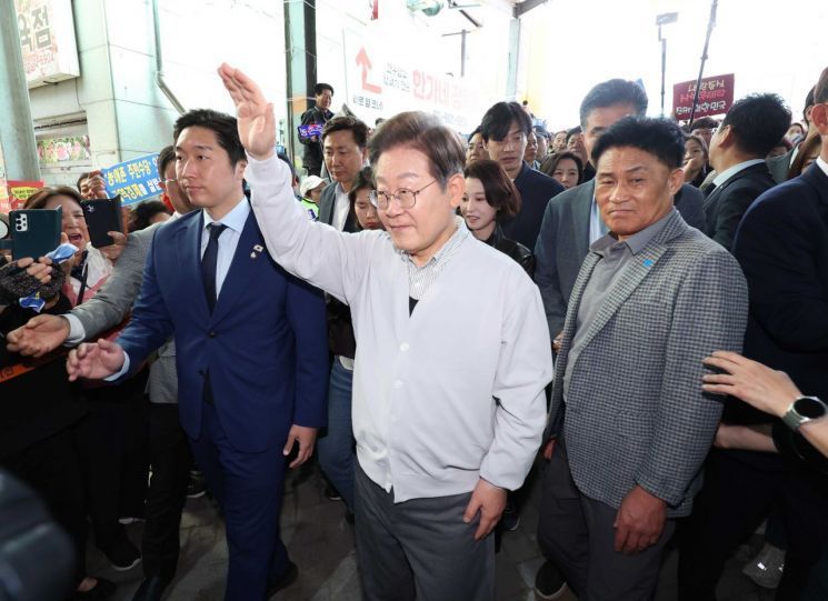 이재명 더불어민주당 대선 후보가 7일 전북 임실군 임실시장에서 시민 및 지지자들에게 인사를 하고 있다. 연합뉴스 제공