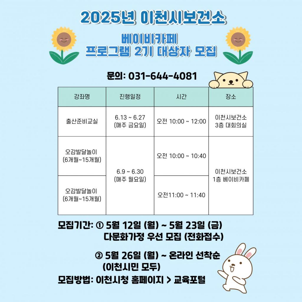 경기도 이천시는 임산부와 영유아를 대상으로 한 '베이비 카페 프로그램' 2기 참가자를 모집한다.