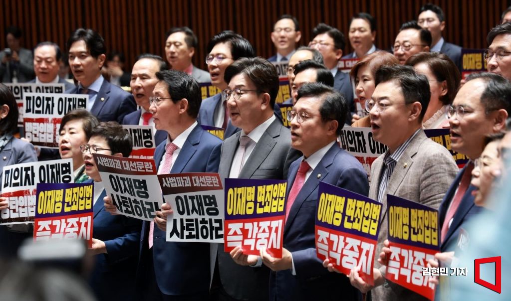 권성동 원내대표를 비롯한 국민의힘 의원들이 7일 국회에서 열린 의원총회에서 더불어민주당 주도의 '대통령 당선시 재판정지' 형사소송법 개정안에 대한 국회 법제사법위원회 의결에 반대하며 "이재명 면죄 입법 반대" 구호를 외치고 있다.