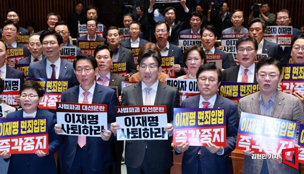 권성동 원내대표를 비롯한 국민의힘 의원들이 7일 국회에서 열린 의원총회에서 더불어민주당 주도의 '대통령 당선시 재판정지' 형사소송법 개정안에 대한 국회 법제사법위원회 의결에 반대하며 "이재명 면죄 입법 반대" 구호를 외치고 있다.