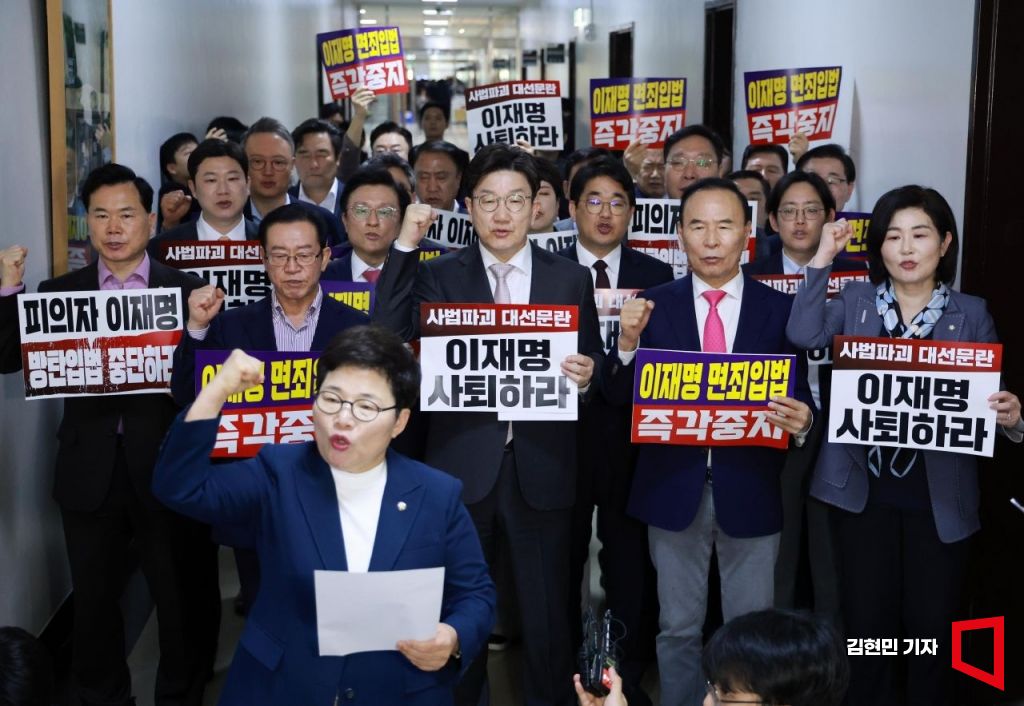 국민의힘 의원들이 7일 국회 법제사법위원회 전체회의장 앞에서 ‘이재명 면죄입법 즉각중지’ 등의 내용이 적힌 손팻말을 들고 구호를 외치고 있다.