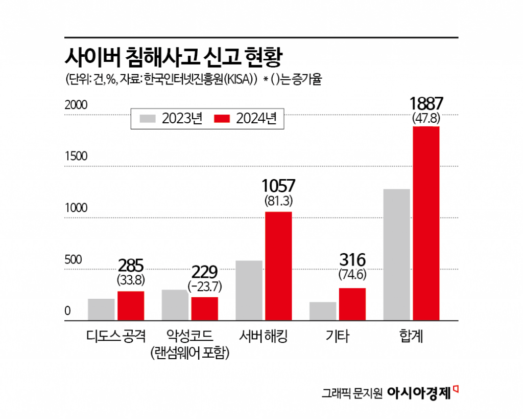 한국인터넷진흥원(KISA)에 따르면 지난해 사이버 침해사고 신고는 1887건으로 전년 대비 48% 증가했다. 랜섬웨어 감염 피해는 195건으로 전년 대비 24% 줄었지만, 전체 피해의 94%가 대기업 대비 보안 투자가 어려운 중소·중견기업에 집중됐다. 이는 해커들이 보안이 취약한 중소기업 웹사이트를 해킹 경유지로 삼거나, 해당 사이트를 대상으로 관리자 권한을 탈취하는 악성코드인 '웹셸' 공격을 늘리며 피해가 확산한 것으로 풀이된다.