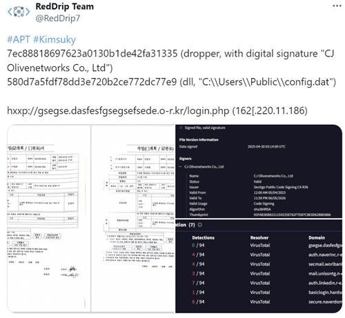 이번 해킹에 연루된 북한 해킹집단은 '김수키'로 의심되고 있다. 중국 보안기업 레드드립팀은 전날 김수키가 탈취한 CJ올리브네트웍스의 디지털 서명 정보를 악용해 국책 연구기관인 한국기계연구원을 공격하려 했다는 정황도 함께 공개했다. 기계연은 현재는 조치를 완료했고, 문서 유출에 대해 업체에 설명을 요청했다고 밝혔다.
