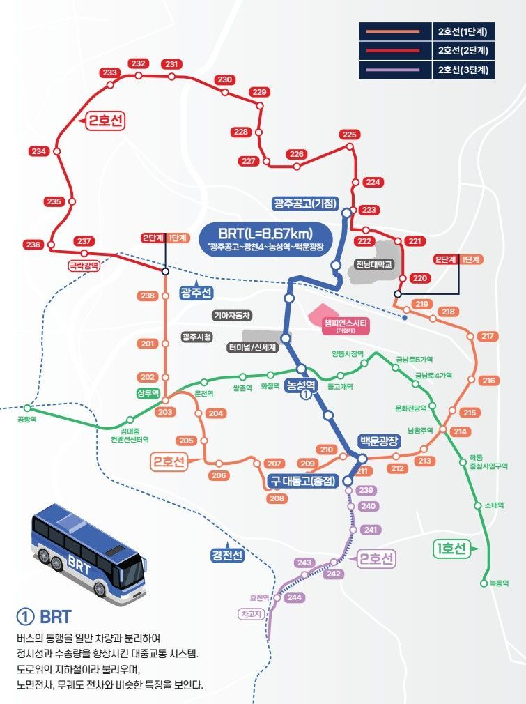 시가 추진하는 '대·자·보(대중교통·자전거·보행) 도시 조성 사업'의 하나인 BRT는 광주 남북축에 신속성·정시성 등을 갖춘 새로운 대중교통수단을 도입하는 사업이다. 이를 통해 교통혼잡을 해소하고 친환경 교통체계를 구축해 탄소중립 도시로의 전환을 가속화한다는 계획이다.