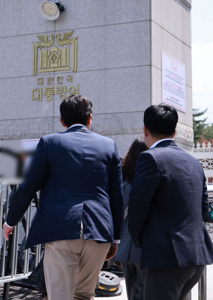 윤석열 전 대통령이 연루된 해병대원 순직 사건 외압 의혹을 수사하는 고위공직자범죄수사처 관계자들이 7일 서울 용산 대통령실 민원실로 들어가고 있다. 연합뉴스