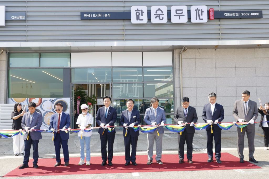 진교훈 강서구청장(앞줄 왼쪽 다 섯번째)이 7일 ‘한술두찬 김포공항점’ 개소식에서 참석자들과 테이프 커팅을 하고 있다. 강서구 제공.
